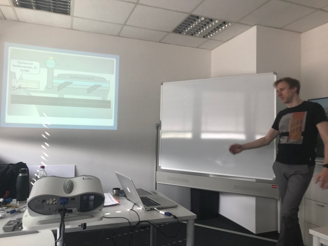 Hierzu wurden heute zunächst einige Begriffe erklärt und eine Kontrollzone schematisch an die Tafel gezeichnet. Danach ging es an die üblicherweise verwendeten Sprechgruppen beim Ausflug aus einer Kontrollzone am bekannten Beispiel des Dortmunder Flughafens. Dies erwies sich als schwieriger als zunächst gedacht, sollte man doch genau auf die korrekte Verwendung der Phrasen achten! Mit ein wenig Übung klappte aber auch das Mitschreiben der vom Dozenten gegebenen Beispiele. Diesem muss dennoch ein großes Lob für seine Geduld mit uns ausgesprochen werden – man kann sich ohnehin keinen besseren Trainer vorstellen als einen Fluglotsen eines Verkehrsflughafens. Martin sitzt also auch auf dem Turm, wenn wir mit den Cessnas hier unsere Platzrunden drehen.