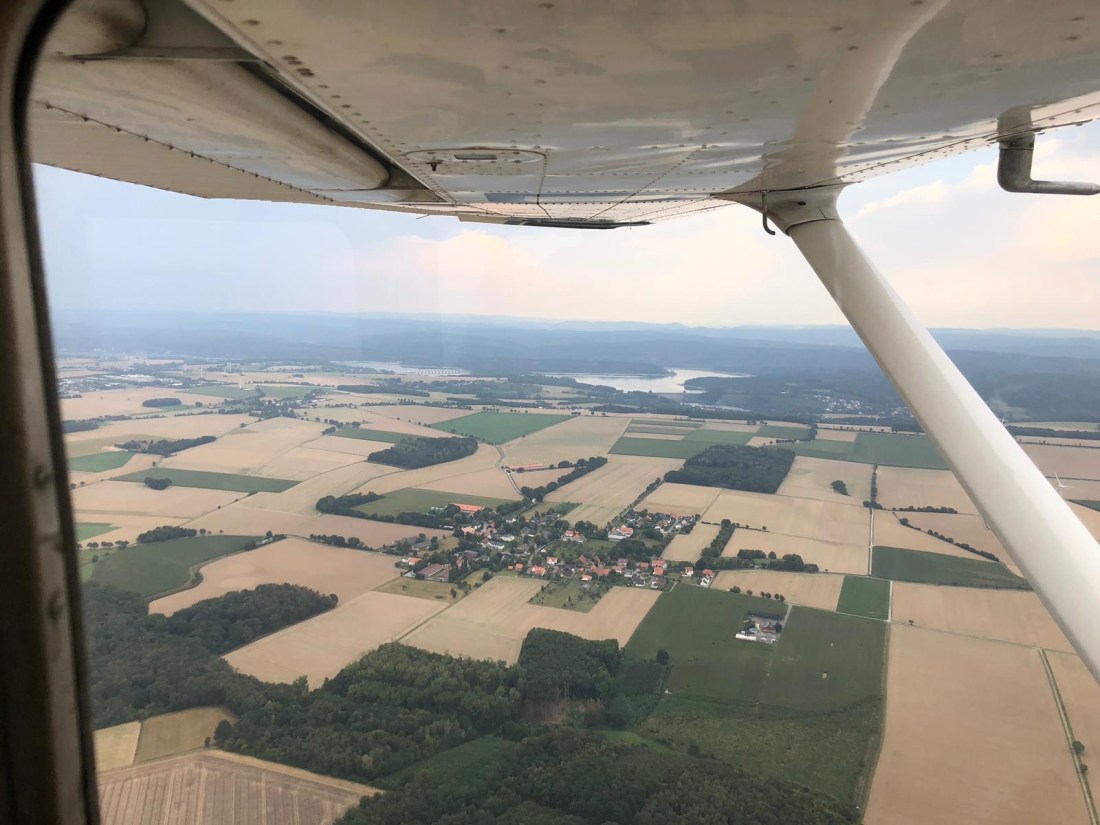 Weitergehen sollte es dann zum Flugplatz Oelde, einem kleinen Grasplatz für Segelflug. Nun ist mir die Gegend dort nicht unbekannt, die Orte, die wir überflogen kenne ich von diversen Ausflügen und Dienstfahrten. Und so erkennt der Pilot auf Anhieb Freckenhorst, Ennigerloh und dahinter dann auch schon Oelde – mitsamt Flugplatz. Den Kurs geändert, weiter geht es in Richtung Lippstadt. Auf dem Weg dorthin sehen wir die ersten Blitze in der Ferne, aber die Gewitter verweilen recht statisch an ihren Orten und sind noch so weit entfernt, dass sie keine Gefahr für uns darstellen. Ein wenig windiger wird es aber doch, und so ist es gut dass wir planmäßig Kurs auf Arnsberg nehmen können und uns so vom schlechten Wetter wieder entfernen. Bald tauchte links von uns der Möhnesee auf, und so war es nach Arnsberg auch nicht mehr weit.