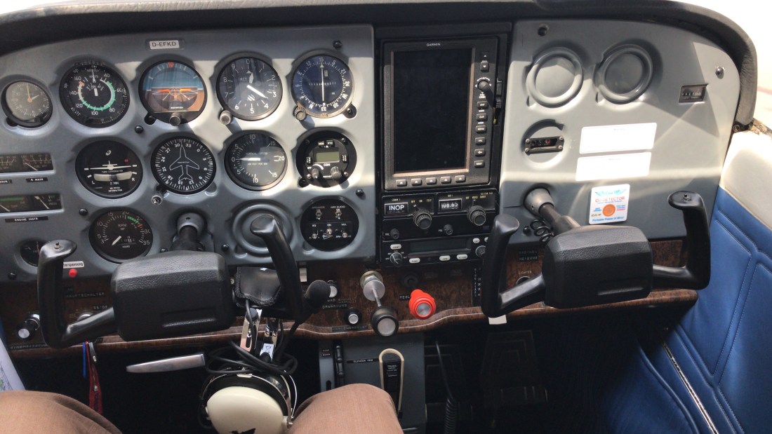 Er stieg hinzu und meinte dass es dann ja losgehen könne… also kein weiterer Check mit ihm zusammen, er vertraute mir – tolles Gefühl ! Und so setzte ich die Systeme in Gang und startete den Motor, der nach wenigen Anlasserumdrehungen seine Arbeit aufnahm. 1000 rpm eingestellt, Öldruck und Amperemeter kontrolliert, auch den Füllstand der Tanks nicht ausgelassen, danach auf 1700 rpm erhöht und die Doppelzündanlage auf korrektes Arbeiten kontrolliert, Bremsen gecheckt – und los ging es.