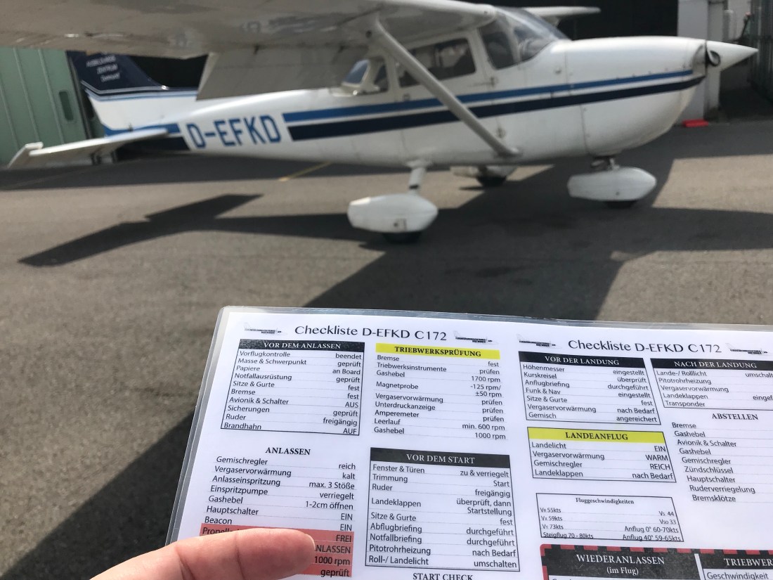 So begab ich mich heute zur Flugschule, wo Christof noch ein Telefonat führte, mir aber schon einmal Handbuch und Schlüssel für die „Kilo-Delta“ reichte und meinte, ich solle schon einmal die Vorflug-Kontrolle erledigen und mich dann ins Flugzeug setzen. Sein Hinweis, danach aber nicht auch noch ohne ihn los zu fliegen, war, wie ich ihm versicherte, unnötig, da ich wirklich, wirklich noch nicht auf ihn verzichten mag…