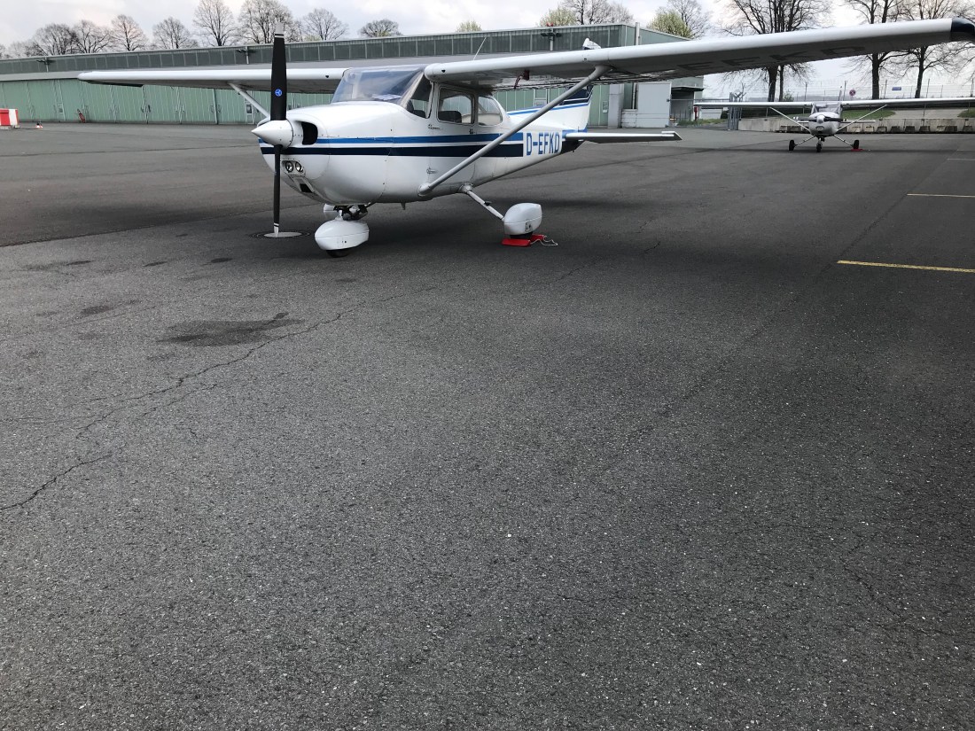 Nach der Landung dann das lange rollen zum GAT, was uns zuvor vom Tower schon genehmigt wurde, und das Flugzeug wie beim letzten Mal vor dem Hangar abgestellt. Christof gab mir noch auf nach Checkliste die Cessna zu parken und verschwand… also brachte ich die Rudersicherung an, legte die Klötze vor und hinter die Räder und deckte das Pitotrohr (Dies wird u.a. zur Geschwindigkeitsmessung in der Luft benötigt) ab. Schließlich schloss ich das Flugzeug ab und begab mich zur Flugschule.
