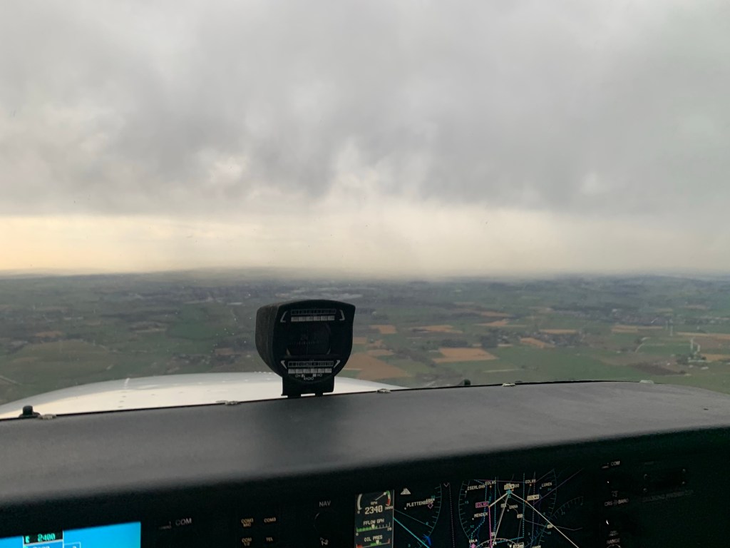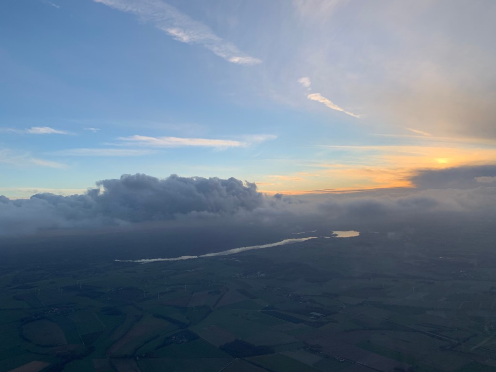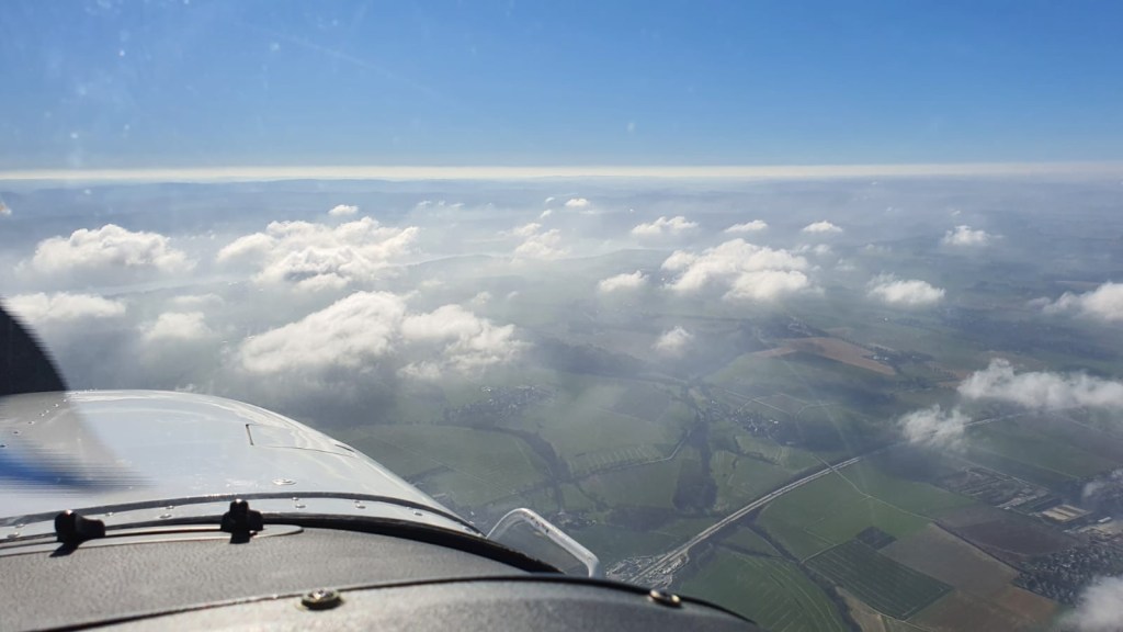 Also nahmen wir erst einmal groben Kurs auf Borkenberge, jedoch mussten wir nach einigen Minuten Flug leider sehen, dass wir nichts sehen – wir saßen in einer fetten Wolke. Lehrbuchmässig flohen wir eine Umkehrkurve von 180 Grad, kletterten sicherheitshalber noch einige hundert Fuß, um nicht einen Kraftwerkskamin oder ähnliches in seinem Winterschlaf zu stören und teilten der Freundlichen Stimme von Langen Radar mit, dass wir nun doch bereit wären, den direkten Rückzug nach Dortmund anzutreten. Die Dame gab uns das Heading (den Kompass-Steuerkurs), und heimwärts ging es!