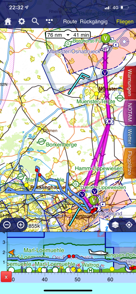Unser Plan sah vor, in Dortmund zu starten, über Whisky aus der Kontrollzone auszufliegen, dann über das HMM-VOR in Richtung Münster-Osnabrück zu fliegen, dort ein Touch & Go zu absolvieren und wieder über November nach Dortmund zurückzukehren. Entsprechende Flugpläne gaben wir auf, denn Nachts darf nur mit gültigem Flugplan geflogen werden.