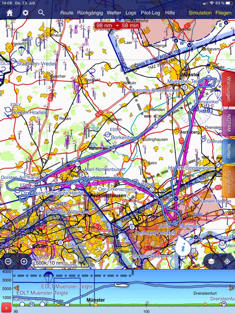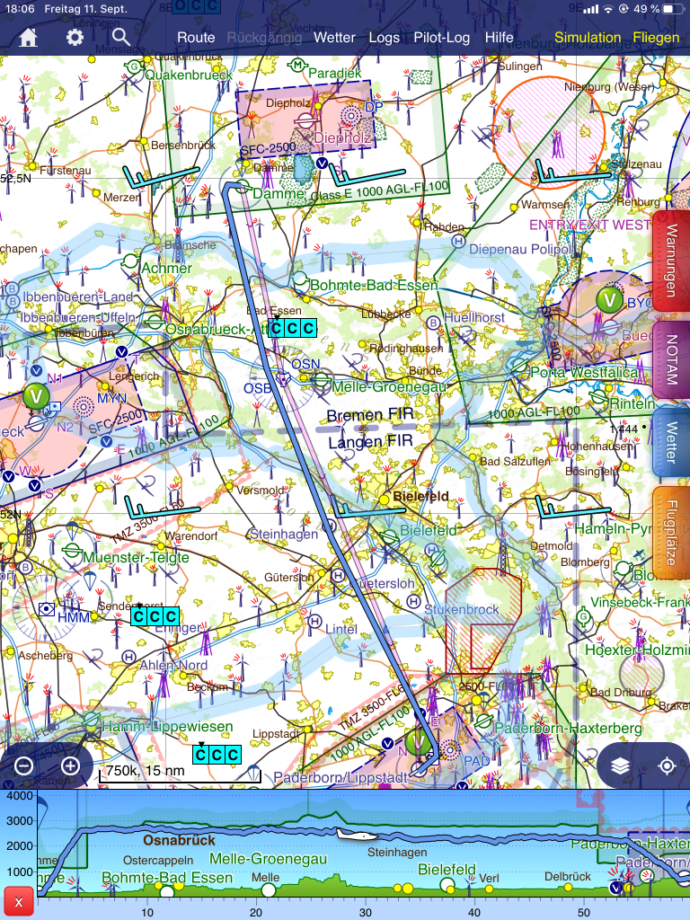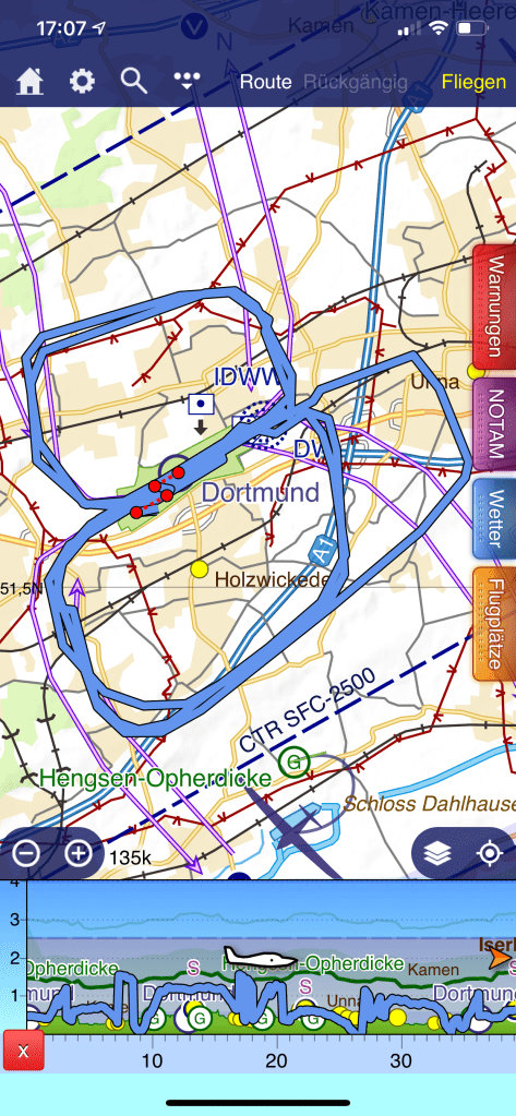Geplant und durchgeführt wurde von mir ein Flug von Dortmund nach Damme, von dort weiter nach Paderborn und wieder zurück nach Dortmund; dieses Mal sind an jedem Punkt Landungen vorgesehen.
