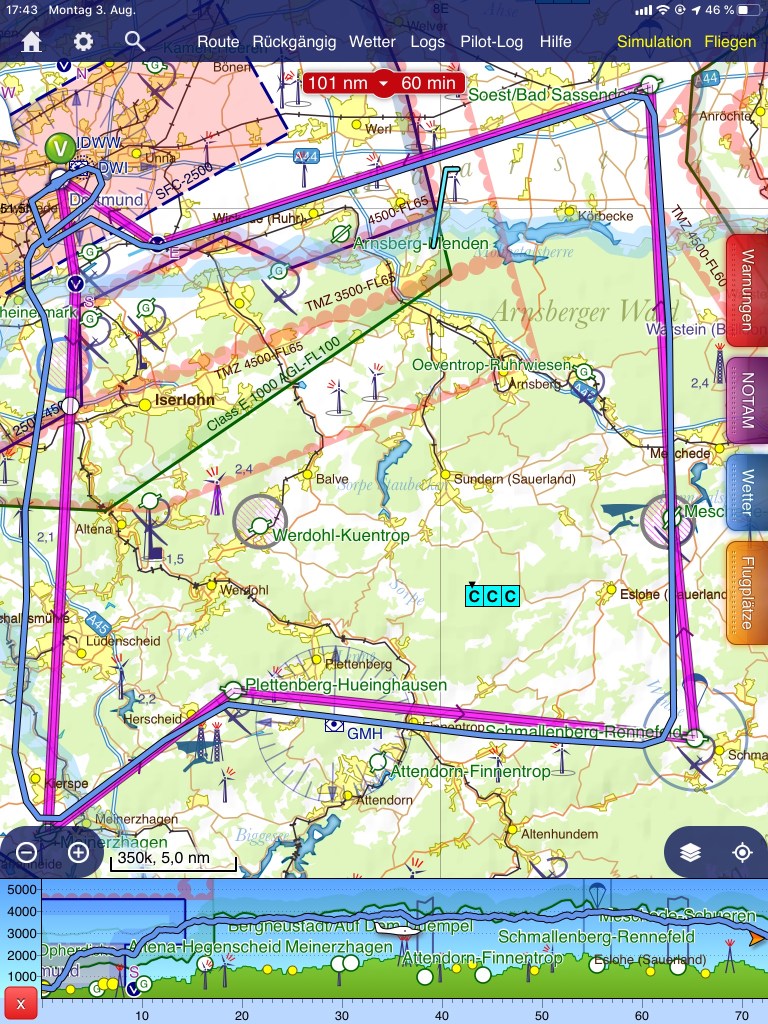 Spannend wurde es dann nach Erreichen von Lippstadt, denn es sollte dann aus dem flachen Münsterland in das des Sauerlandes gehen. Die Mindestflughöhe für diesen Bereich liegt bei 3400 ft., ich stieg auf etwa 3700 ft., besser Dich noch ein wenig mehr Reserve…